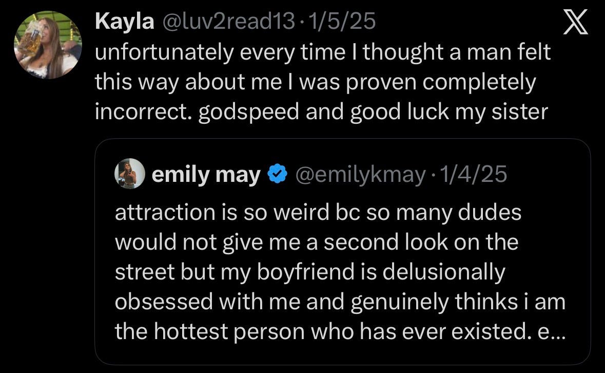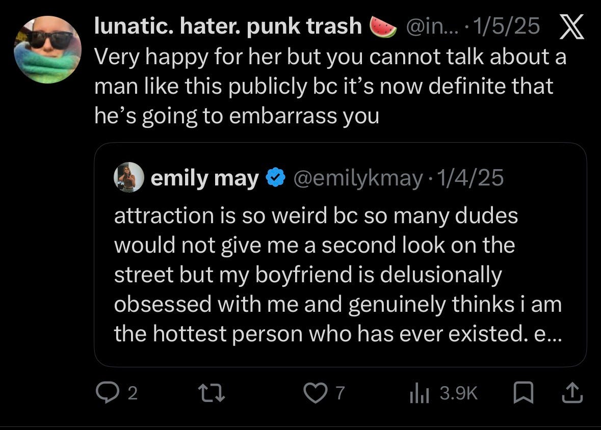 I’ve felt this in my own little corner of the internet. Whenever I’ve posted about something kind my partner has done, the responses are reliably the same: “Don’t let that man embarrass you.” Don’t let yourself believe you’re the exception. I understand the impulse, unfortunately.